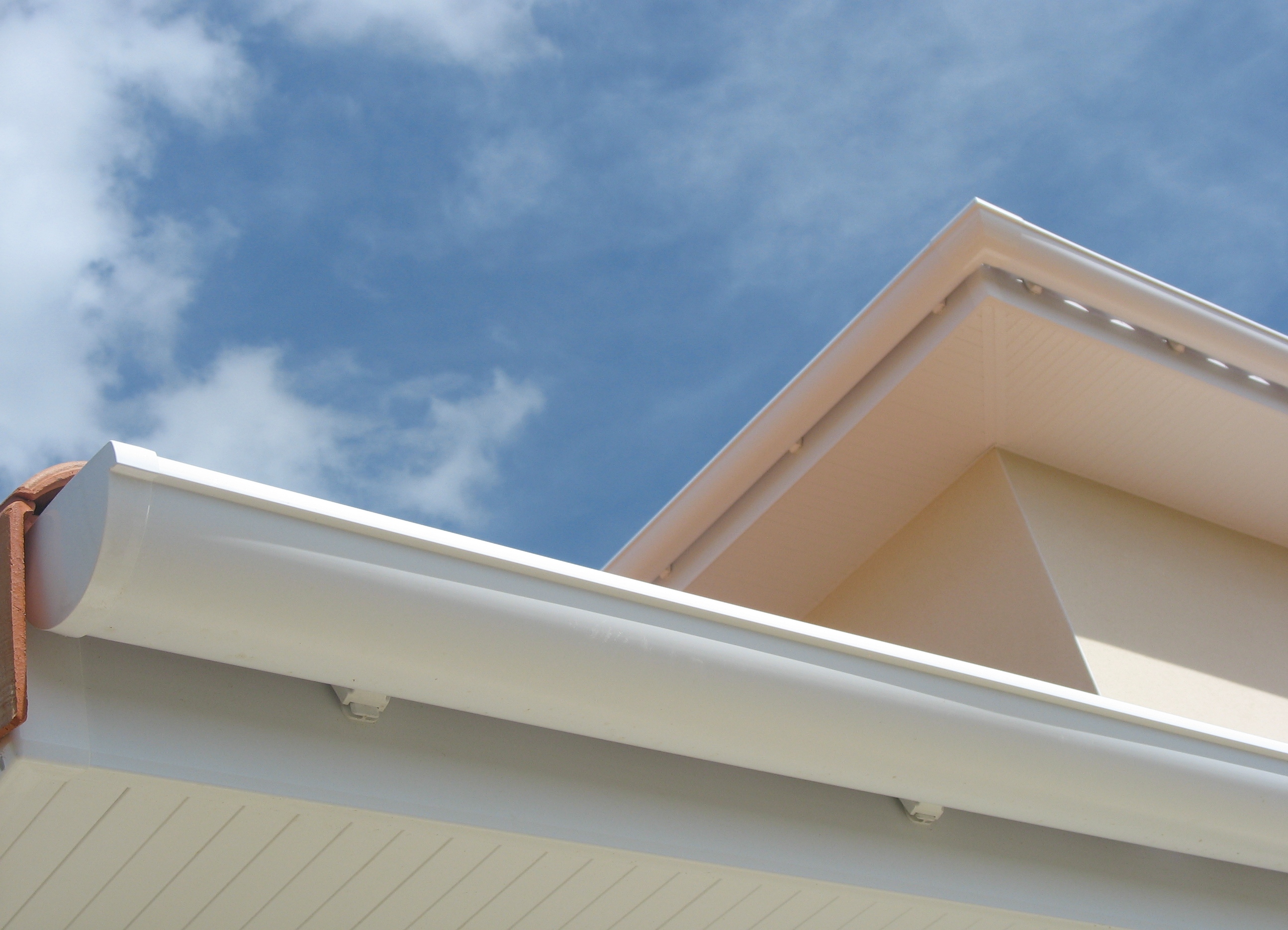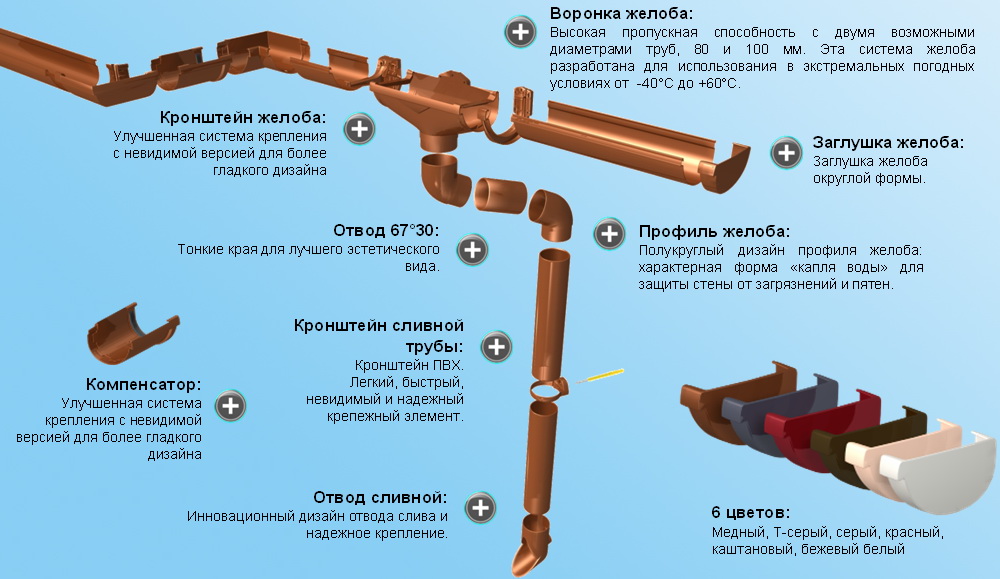 - Водосточная система из ПВХ с добавлением оксида-титана, клеевое соединение, применяется при коттеджем и малоэтажном строительстве с желобом каплевидной формы