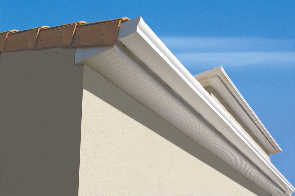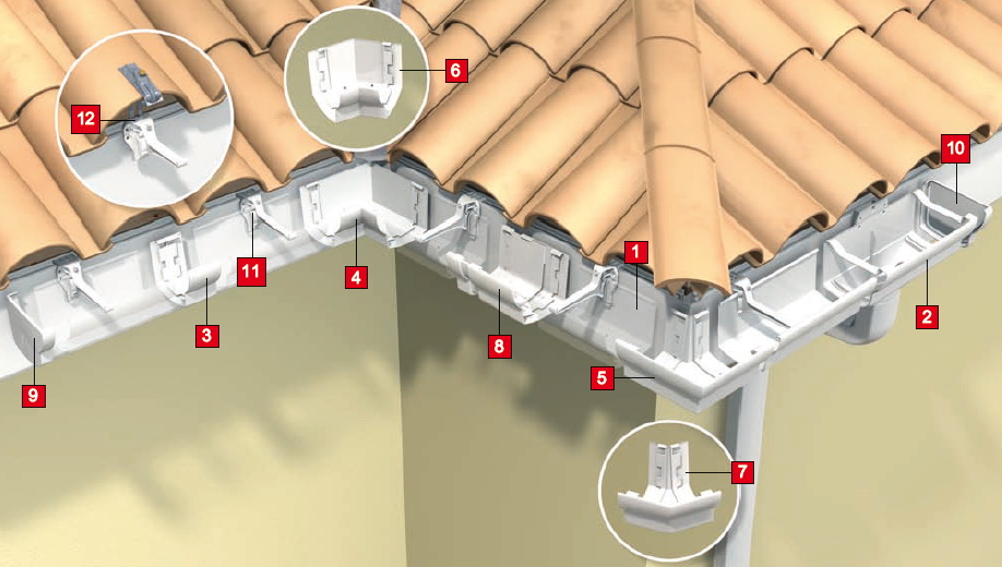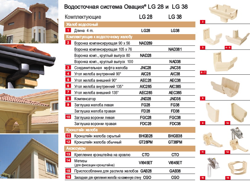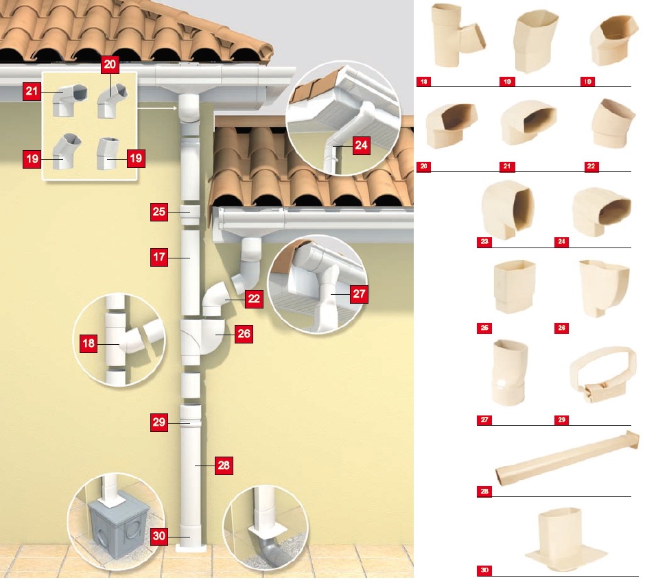 - Водосточная система из ПВХ с добавлением оксида-титана, клеевое соединение ,применяется при коттеджем и малоэтажном строительстве с желобом трапециевидной формы